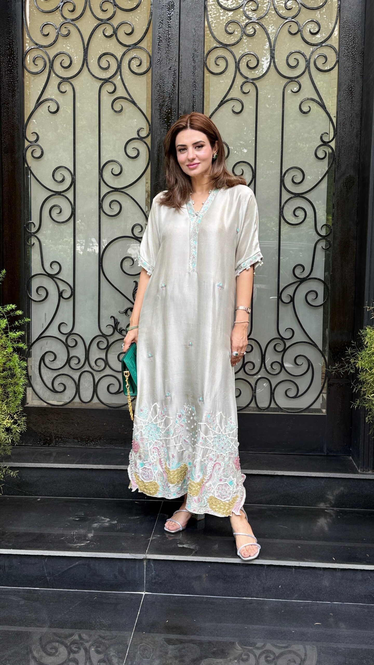 Our raw silk pale grey kaftan is a captivating blend of the embroidery with refined elegance. Adorned with embroidery in pastel hues – It is further enhanced with applique work, adding a dreamy aspect to its design.